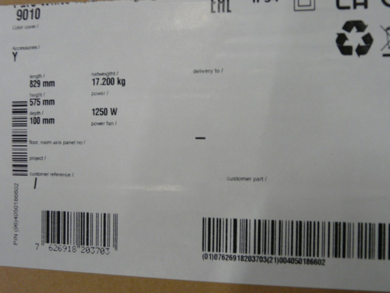 | Opmerkingen | Electrische radiator 1250W. Kleur 9010 (pure white) |