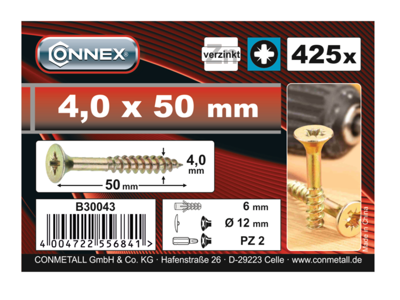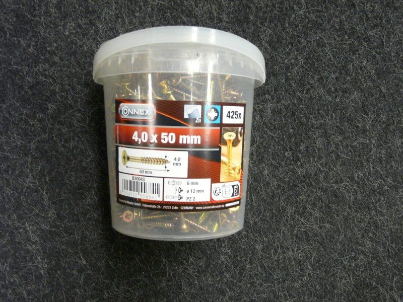 | Opmerkingen | Pz- schroef Connex met verzonken kop in een emmer. Totaal 425 stuks Lengte 50 mm Diameter 4 mm materiaal : verzinkt |